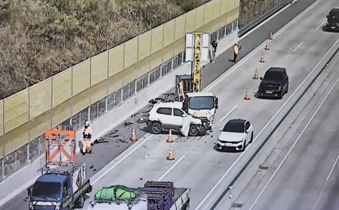 16일 오전 10시 13분쯤 충남 부여 은산면 익산평택고속도로에서 하행선을 달리던 차량이 도로 작업 차량을 추돌했다.