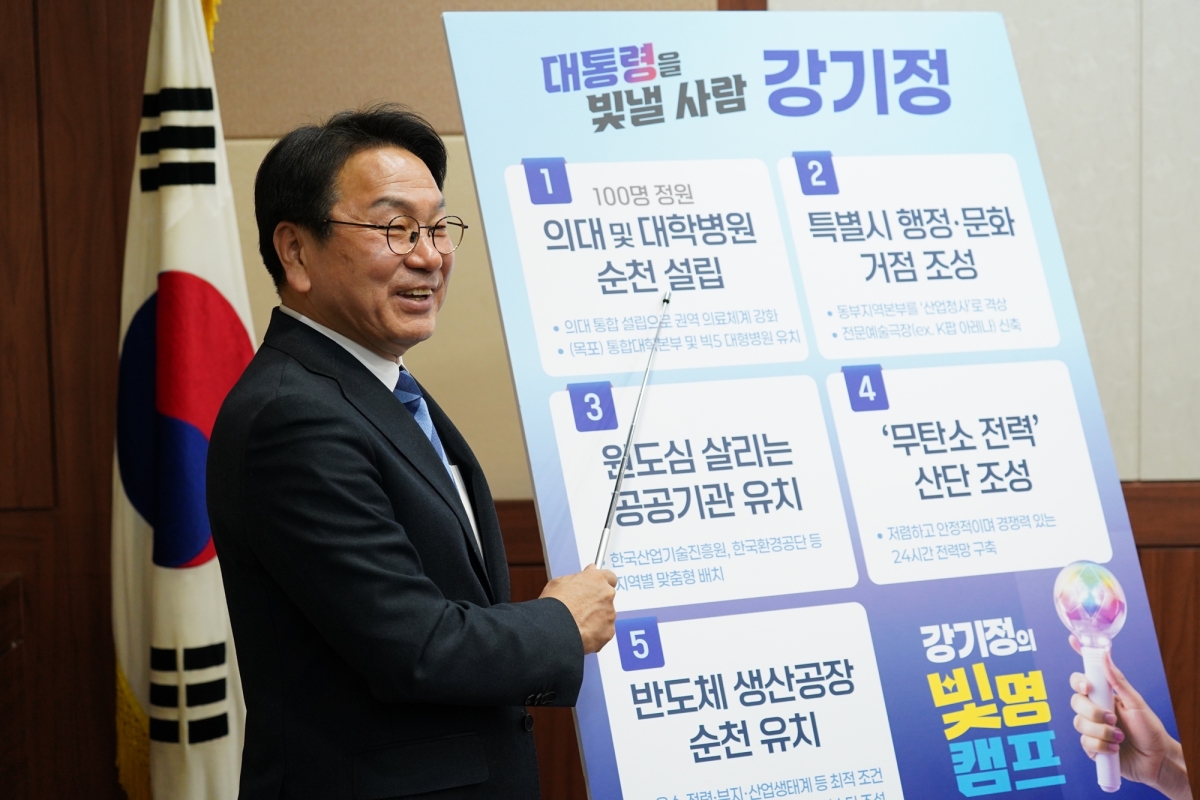 강 후보는 "동부권을 다시 대한민국 산업의 수도이자 아시아인이 찾는 대표 휴양도시로 만들겠다"며 "동부권은 대한민국에서 가장 강한 광역생활권이 될 것이다"고 강조했다.
