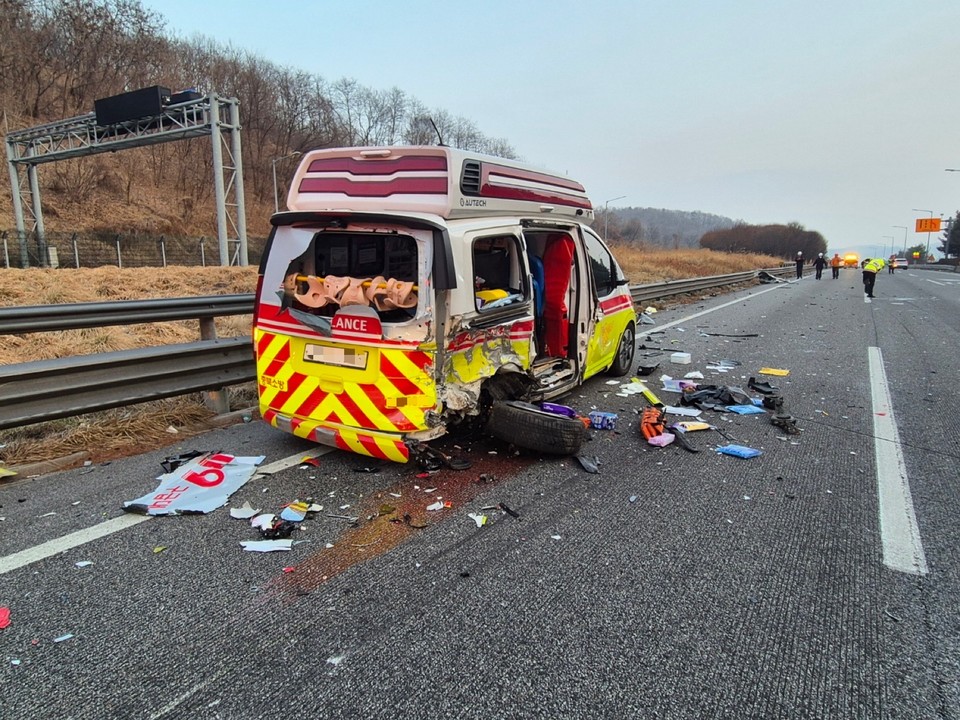지난 15일 오후 5시 56분쯤 충북 충주시 중부내륙고속도로 중원터미널 인근에서 A씨가 몰던 승용차가 119구급차를 들이받았다. 사고 당시 구급차는 앞서 발생한 교통사고의 현장 수습을 위해 도로 1차로에 정차해 있던 것으로 알려졌다.