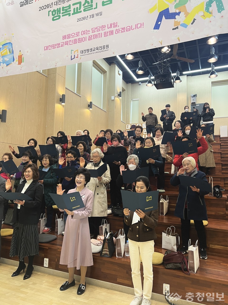 대전평생교육진흥원이 16일 대전사회혁신센터 커먼즈필드 ‘모두의 공터’에서 2026년 초등학력인정 성인문해교육 ‘행복교실’ 입학식을 개최한 가운데 입학생들이 학습자 선서를 하며 새로운 배움의 출발을 다짐하고 있다 |