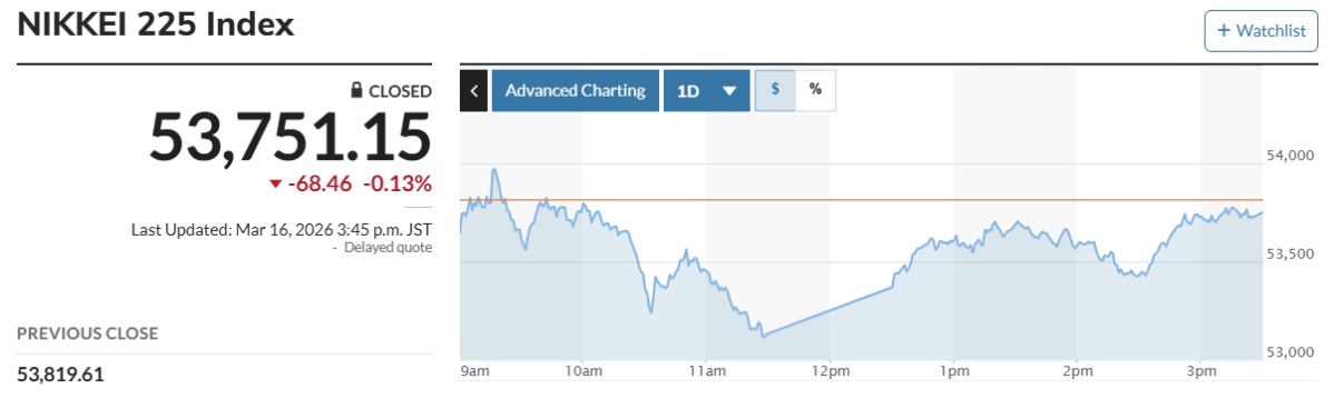 마켓워치에 따르면 일본 증시 대표 지수인 닛케이225지수(닛케이)는 전 거래일 대비 68.46엔(0.13%) 내린 5만3751.15엔으로 마감했다. 토픽스는 전 거래일 대비 18.30포인트(0.50%) 내린 3610.73에 마감했다.