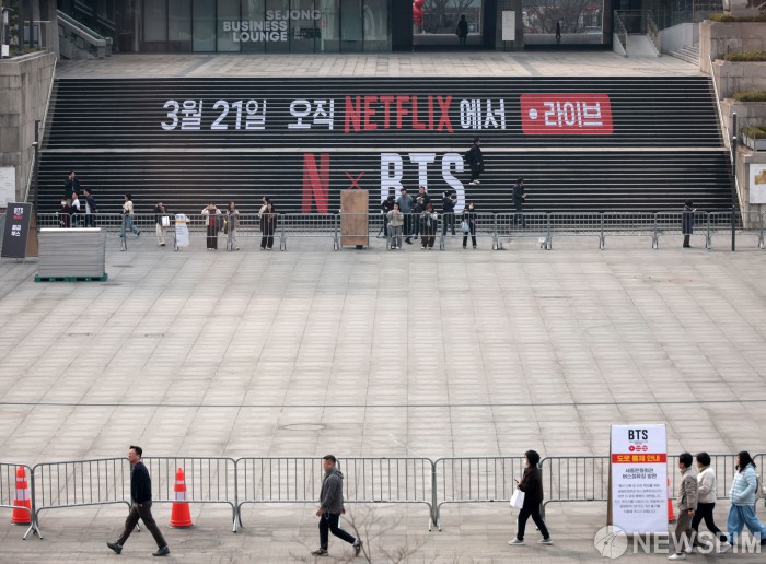 [서울=뉴스핌] 이건주 인턴기자 = 시민들이 16일 오후 서울 종로구 세종문화회관 계단에 설치된 방탄소년단 'BTS 컴백 라이브: 아리랑(BTS THE COMEBACK LIVE|ARIRANG)' 대형 홍보물 앞을 지나가고 있다. 2026.03.16 kunjoo@newspim.com