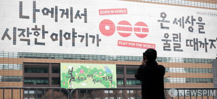[서울=뉴스핌] 이건주 인턴기자 = 16일 오후 서울 종로구 광화문 광장에 설치된 방탄소년단 'BTS 컴백 라이브: 아리랑(BTS THE COMEBACK LIVE|ARIRANG)' 대형 홍보물을 한 시민이 스마트폰에 담고 있다. 2026.03.16 kunjoo@newspim.com