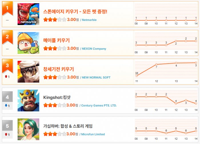 2위에는 ‘메이플 키우기’가 자리했다. 장기간 1위를 지배했던 독주 체제는 끝났지만 여전히 상위권을 안정적으로 유지하며 방치형 장르 대표 주자로서의 존재감을 이어가고 있다.