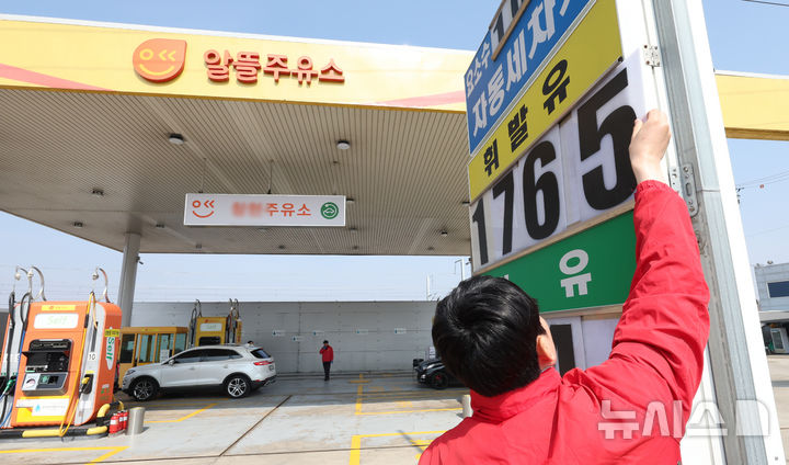 [청주=뉴시스] 강종민 기자 = 16일 충북 청주의 한 알뜰주유소에서 관계자가 가격표시판 숫자를 조정하고 있다. 2026.03.16. ppkjm@newsis.com |