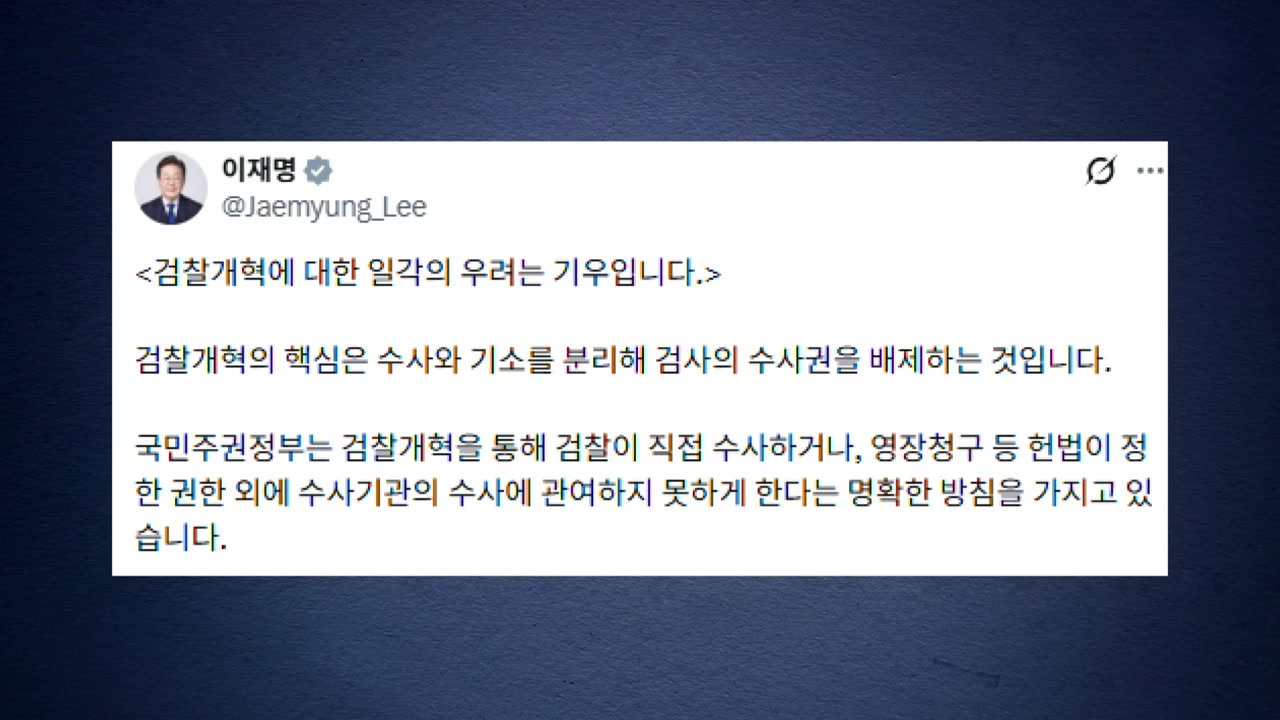 이 대통령은 오늘(16일) SNS에, 수사·기소 분리와 검찰의 수사 배제는 국정과제로 이미 확정됐고 돌이킬 수 없다며 이같이 밝혔습니다.