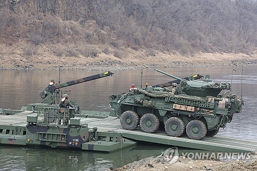 (연천=연합뉴스) 임병식 기자 = 14일 경기도 연천군 임진강에서 실시된 한미연합 도하훈련에서 주한미군 스트라이커 장갑차가 부교를 건너고 있다. 한미연합훈련 '자유의 방패'(프리덤실드·FS) 연습 일환으로 실시된 이번 훈련에는 미2사단/한미연합사단과 한국군 수도기계화보병사단 및 7공병여단이 참가했다. 2026.3.14 andphotodo@yna.co.kr |