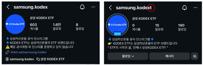 사칭 계정은 정교했다. 삼성자산운용의 공식 인스타그램 계정명은 '@samsung.kodex'이지만, 사칭 계정은 '@samsung.kodext'를 사용했다. 알파벳 't' 하나를 추가해 언뜻 보면 공식 계정과 비교하기 힘든 계정명을 내걸어 교묘하게 위장한 것이다. 심지어 프로필사진과 프로필 설명란마저 똑같이 만들어 이용자의 눈을 속였다. 해당 계정은 현재 삭제됐지만, 철자를 바꾼 다른 유사 계정들이 여전히 활동 중인 것으로 나타났다.