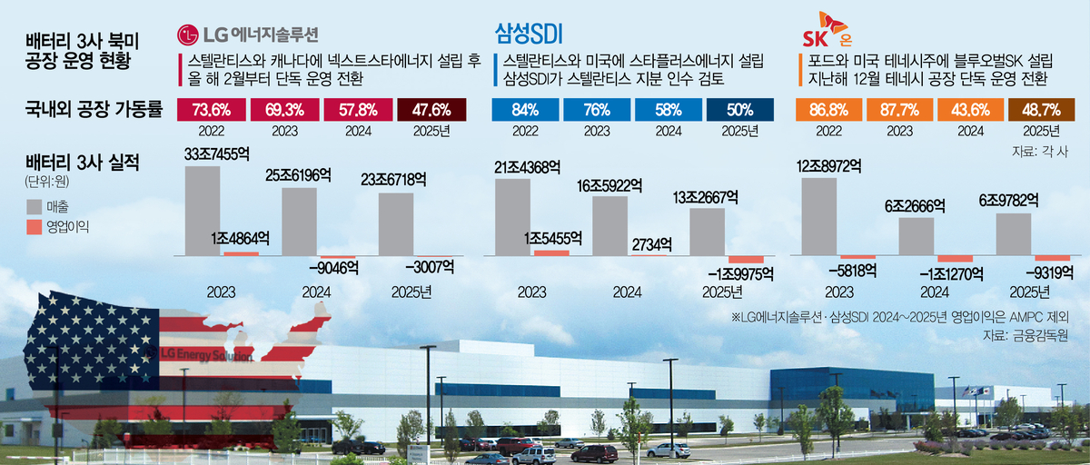 배터리 3사는 올해도 적자를 면치 못할 것으로 관측된다. 금융 정보 업체 에프앤가이드에 따르면 올해 삼성SDI는 4508억 원, SK온은 8360억 원의 영업적자를 낼 것으로 추산됐다. LG에너지솔루션은 1조 2263억 원의 영업이익을 낼 것으로 전망됐지만 첨단제조생산세액공제(AMPC) 보조금을 제외하면 마찬가지로 수천억 원의 적자가 불가피하다. 지난해에도 LG에너지솔루션은 1조 3461억 원의 영업이익을 기록했는데 이 중 AMPC 보조금이 1조 6000억 원에 달했다.
