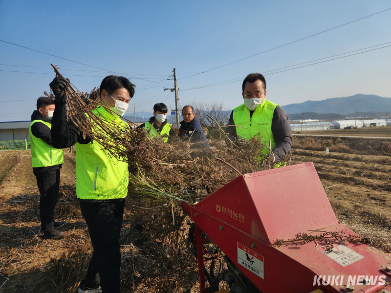 충남세종농협 임직원들이 논산시 부적면 농가를 찾아 파쇄기를 이용하여 영농부산물을 폐기하고 있다. |