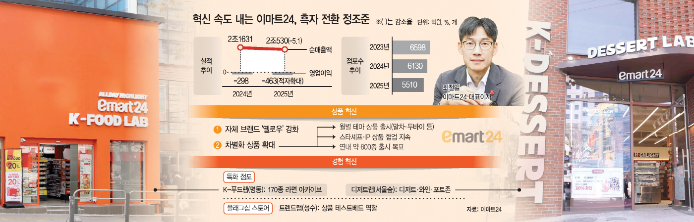 관건은 수익성 여부다. 이마트24는 그룹 내 이커머스를 제외하고 유일하게 적자를 면치 못하고 있는 상황이다. 지난해 이마트24의 순매출액은 2조530억원으로 전년보다 5.1% 줄었고, 영업손실은 463억원으로 전년(298억원)보다 악화됐다. 체질 개선 과정에서 발생한 비용이 원인으로 꼽힌다. 지난해 12월에는 창사 이래 첫 희망퇴직 프로그램도 단행했다. 2022년 한 차례 흑자 이후 이어진 적자의 고리를 끊기 위해, 올해 실행하는 상품과 점포 개편의 속도전이 흑자 전환의 실질적인 발판이 될 수 있을지 업계의 이목이 쏠리고 있다.