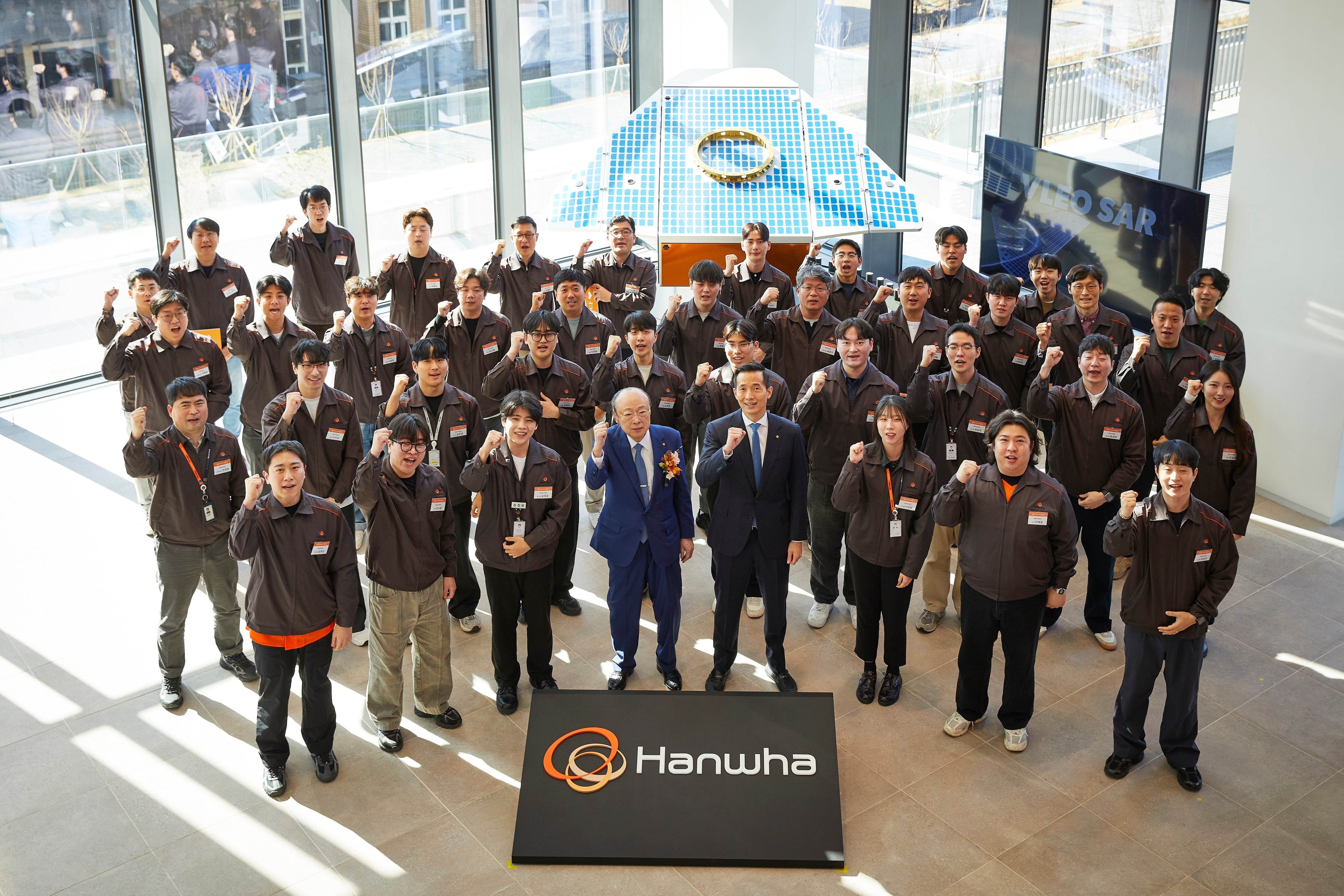 김승연 한화그룹 회장과 김동관 부회장이 8일 한화시스템 제주우주센터 임직원들과 VLEO UHR SAR 위성 실물모형 앞에서 기념사진을 촬영하고 있다. /한화그룹 제공 |