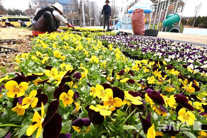 [서울=뉴시스] 포근한 날씨를 보인 16일 경기 평택시 신장근린공원에서 관계자들이 팬지 등 봄꽃을 화단에 심고 있다.