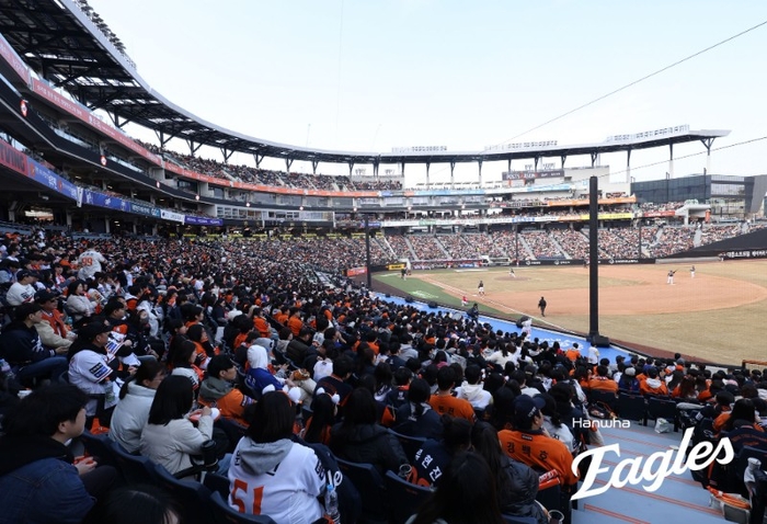 시범경기임에도 유료 티켓이 판매됐지만, 관중석은 가득 찼다. 한화는 지난해 새 구장 개장 이후 73경기 중 65경기 매진을 기록하며 구단 역사상 처음으로 100만 관중을 돌파했다. 올시즌에도 흥행 열풍이 이어질 조짐이다.