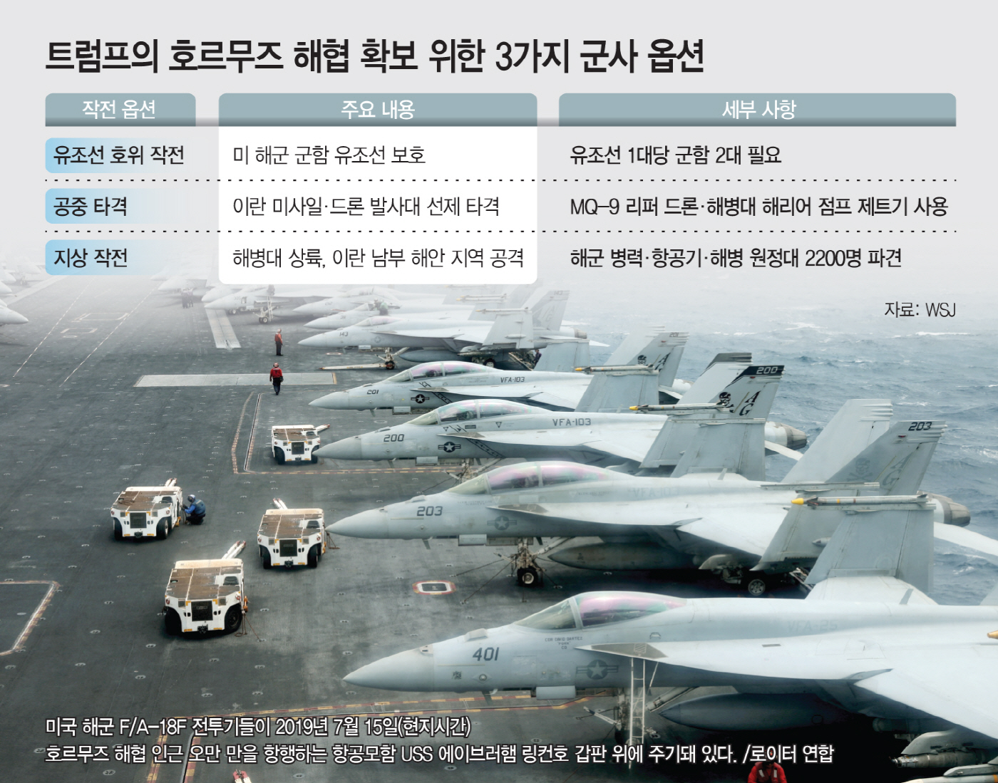 도널드 트럼프 미국 대통령이 사실상 봉쇄된 호르무즈 해협을 확보하기 위해 유조선 호위 작전과 공중 타격, 지상 작전 등 다양한 군사 옵션을 검토하고 있다고 미국 일간 월스트리트저널(WSJ)이 15일(현지시간) 보도했다. 이란이 미사일과 드론, 기뢰까지 동원해 해협 통항을 위협하는 가운데 미국이 군사적 방안을 본격적으로 검토하고 있다는 분석이다.
