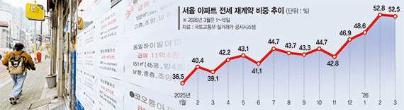 16일 국토교통부 실거래가 공시시스템에 따르면 서울 아파트 전세 재계약 비중은 지난해부터 계속 높아지고 있다. 지난해 1월 36.5%였던 해당 비중은 이재명 대통령이 취임한 6월 41%를 돌파했고 7월 44.7%, 12월 46.9%로 계속 높아졌다. 이후 올해 1월 48.6%로 소폭 오른 재계약 비중은 2월 52.8%를 기록하며 절반을 넘겼다. 3월도 분위기는 비슷하다. 15일 기준 서울 아파트 전세계약 중 재계약 비중이 52.5%다.