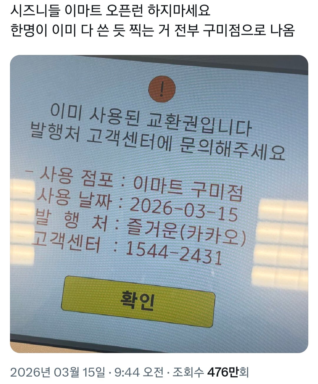 그룹 NCT 멤버 재민이 팬들에게 보낸 상품권이 이마트 구미점에서 "이미 사용된 교환권"으로 나타난다는 내용의 글이 15일 소셜미디어에 올라왔다./X(옛 트위터) |