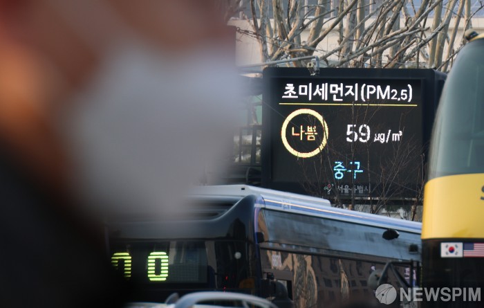 [서울=뉴스핌] 장동규 기자 = 수도권과 충남지역 초미세먼지 농도 위기경보가 발령된 가운데 16일 오후 서울 중구 서울시청 인근 전광판에 미세먼지 농도 수치가 표시되고 있다. 2026.03.16 jk31@newspim.com