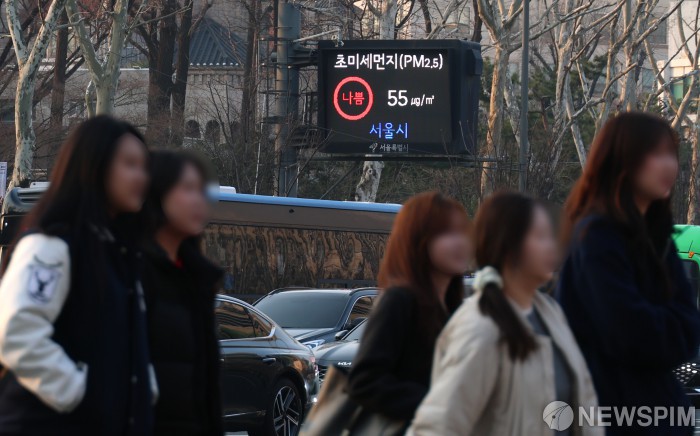 [서울=뉴스핌] 장동규 기자 = 수도권과 충남지역 초미세먼지 농도 위기경보가 발령된 가운데 16일 오후 서울 중구 서울시청 인근 전광판에 미세먼지 농도 수치가 표시되고 있다. 2026.03.16 jk31@newspim.com