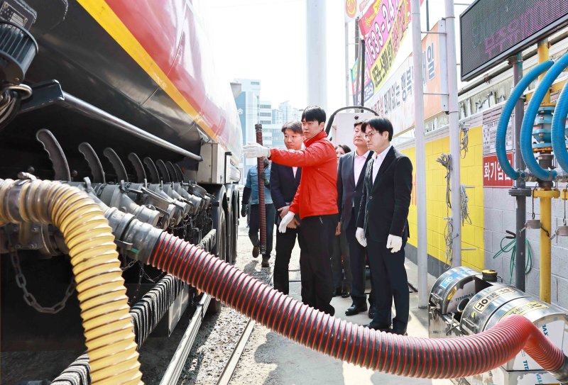 김정관 산업통상부 장관(오른쪽 첫번째)이 16일 충북 청주시 소재 자영 알뜰주유소인 창현주유소를 방문, 최고가격제 시행 이후 주유소 소비자 가격 반영 동향을 점검하고 탱크로리 입하과정을 참관하고 있다. 산업통상부 제공 |