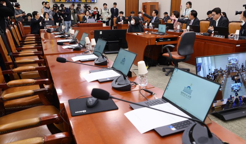 텅 빈 자리 국회에서 16일 오후 법제사법위원회 전체회의가 열렸지만 더불어민주당 의원석이 비어있다. 이날 회의는 코로나19 곰팡이 백신 등과 관련해 국민의힘이 감사원에 대한 현안질의를 요청해 열렸다. 추미애 법사위원장은 안건 미정 상태로 회의를 개의하고 정회를 선포했다. 연합뉴스 |