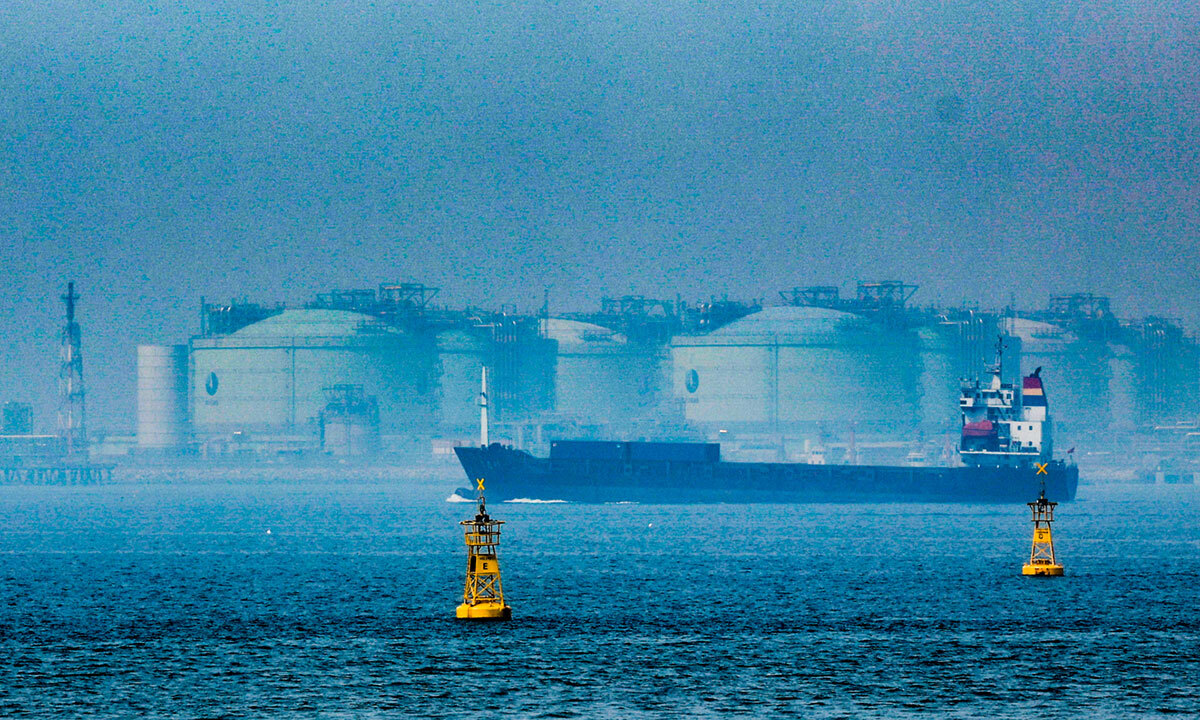 전 세계 원유 및 액화천연가스(LNG) 유통량의 20%가 지나는 핵심 수송로인 호르무즈해협이 봉쇄된 가운데 16일 국내 최대 규모인 인천 연수구 한국가스공사 인천생산기지 내 LNG 저장 탱크 앞으로 한 선박이 지나고 있다.