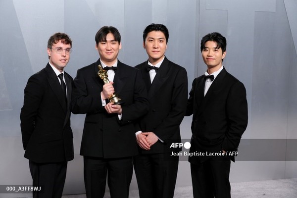 (미국=국제뉴스) 이기철 기자 = 애니메이션 영화 '케이팝 데몬 헌터스'의 미국 작사가 마크 소넨블릭와 작곡가 남희동, 서정훈, 이유한이 15일(현지시간) 미국 캘리포니아 주 로스앤젤레스 카운티 미술관(LACMA)에서 열린 베니티 페어 오스카 파티에 참석해 영화 삽입곡 '골든'으로 아카데미 주제가상 트로피를 들고 포즈를 취하고 있다.