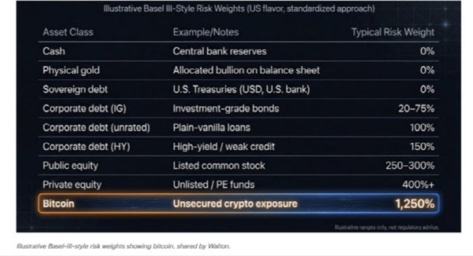 바젤III 규정을 정하는 BCBS는 지난 2022년부터 비트코인을 비롯한 가상자산을 ‘최고위험자산’으로 분류해 은행이 가상자산에 자신의 자산을 투자할 경우 역대 최대 수준인 1250%라는 위험가중치를 부여해 추가적인 자기자본을 쌓도록 권고하고 있다. 이는 은행이 대차대조표에 1달러 어치 비트코인을 보유할 때마다 1달러의 준비자본을 쌓아야 한다는 뜻이다.