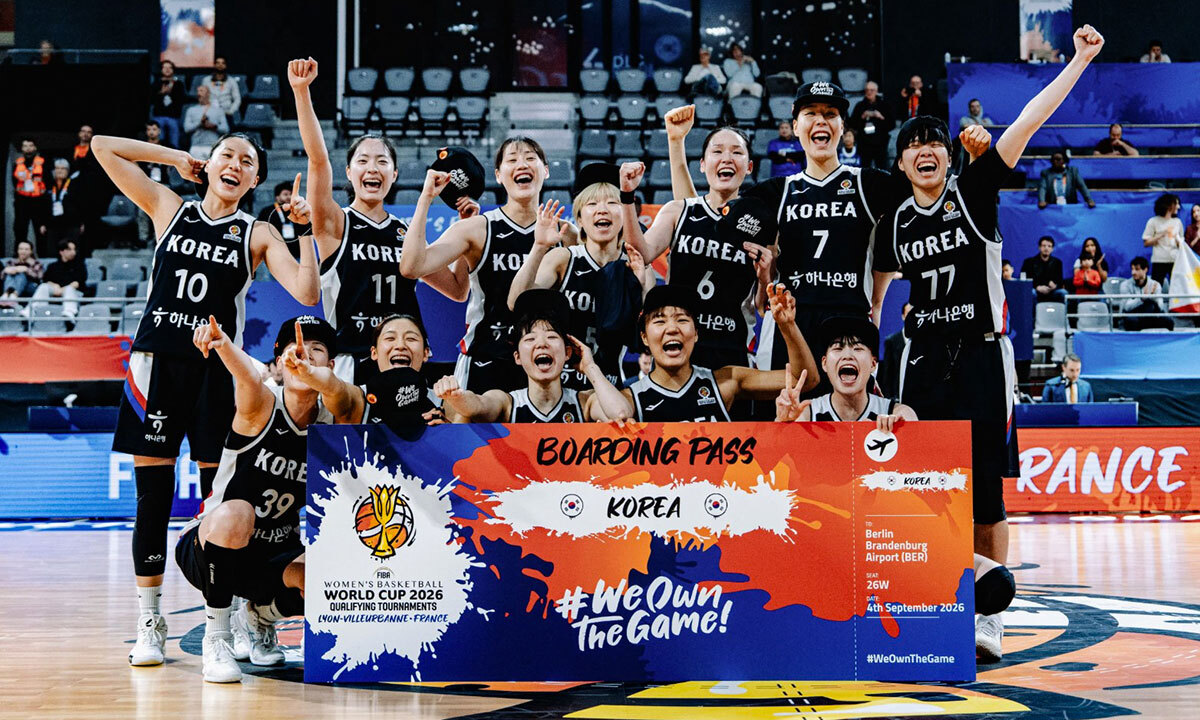 박수호 감독이 이끄는 한국 여자 농구대표팀이 지난 15일 오후 프랑스 빌뢰르반에서 열린 2026 국제농구연맹(FIBA) 월드컵 최종예선 4차전에서 필리핀에 105-74로 대승을 거두고 17회 연속 월드컵 본선 진출을 확정지은 뒤 기념 촬영을 하고 있다. 한국은 최종예선 전적 3승1패로 남은 프랑스와 경기 결과에 상관없이 본선에 진출해 미국과 함께 세계 두 번째로 17회 연속 월드컵 진출이라는 역사를 썼다.