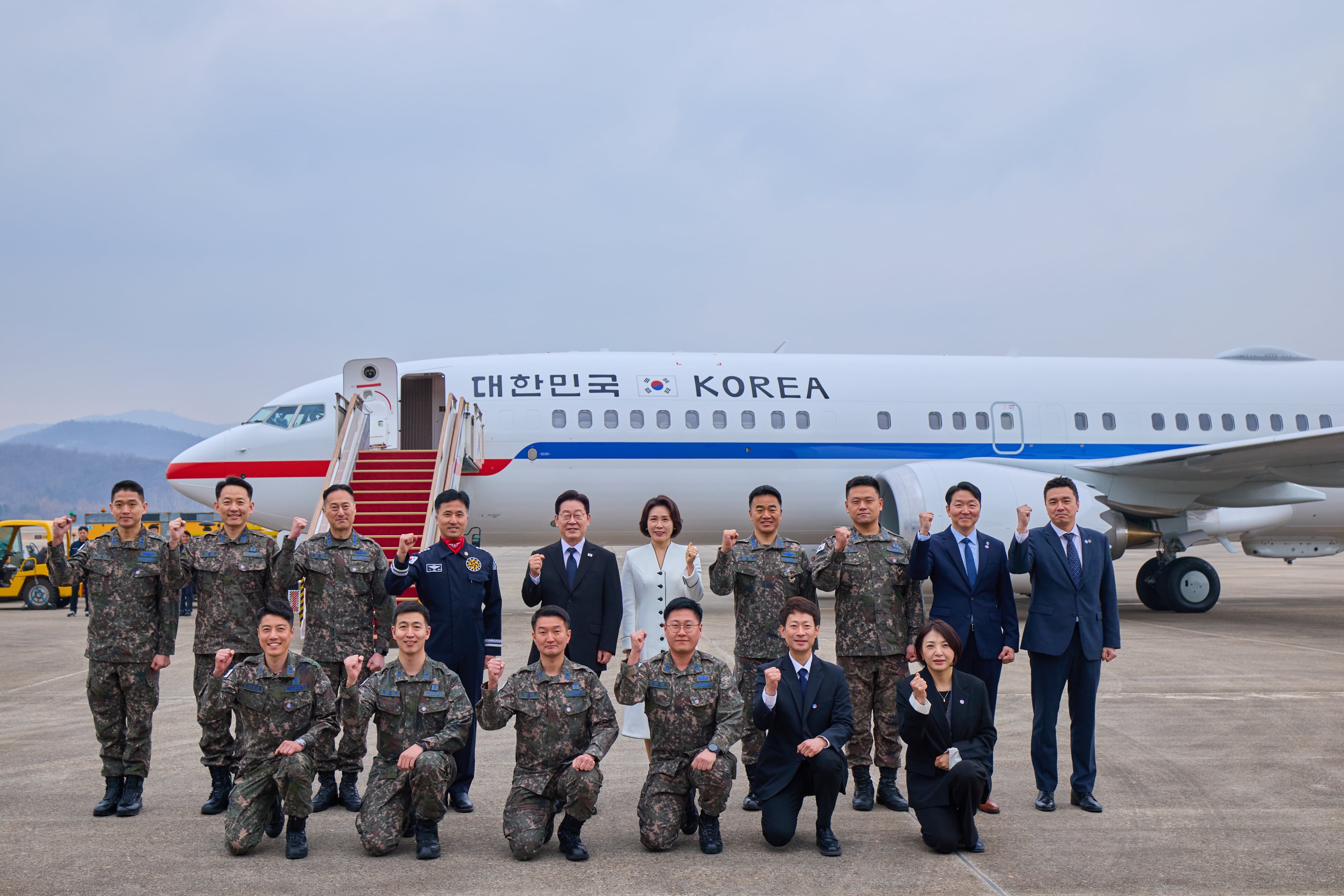 이재명 대통령과 김혜경 여사가 지난 15일 경기 성남 서울공항에서 열린 신형 공군 2호기 개통 행사에서 기념촬영을 하고 있다. /청와대 제공. |