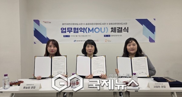 (서울=국제뉴스) 김서중 기자 = 강남문화재단 일원라온영어도서관이 지난 11일 송파어린이영어도서관, 광진어린이영어도서관과 업무협약을 맺었다.