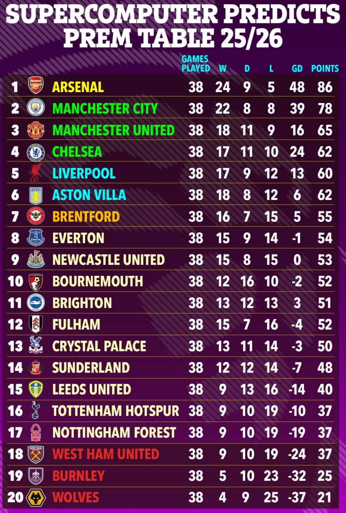 영국의 '더선'은 이날 30라운드 후 슈퍼컴퓨터가 예측한 이번 시즌 예상 순위를 공개했다. 남은 시즌을 1만번 시뮬레이션한 후 결과를 평균하여 최종 예상 순위표를 생성했다.