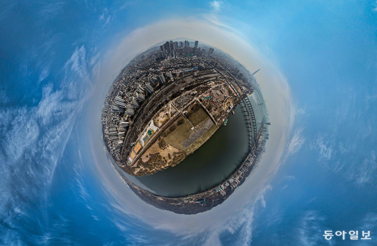 16일 서울 강동구 상공에 드론을 띄워 하늘과 지상 등을 360도로 촬영한 모습. 전국 대부분 지역에서 초미세먼지(PM 2.5) 농도가 ‘나쁨’ 수준을 보인 이날 강동구 일대가 회색빛 미세먼지 띠로 둘러싸여 있다. 17일에도 수도권을 포함한 중부 지방과 충청, 전북은 초미세먼지 농도가 ‘나쁨’ 수준을 이어갈 것으로 보인다.