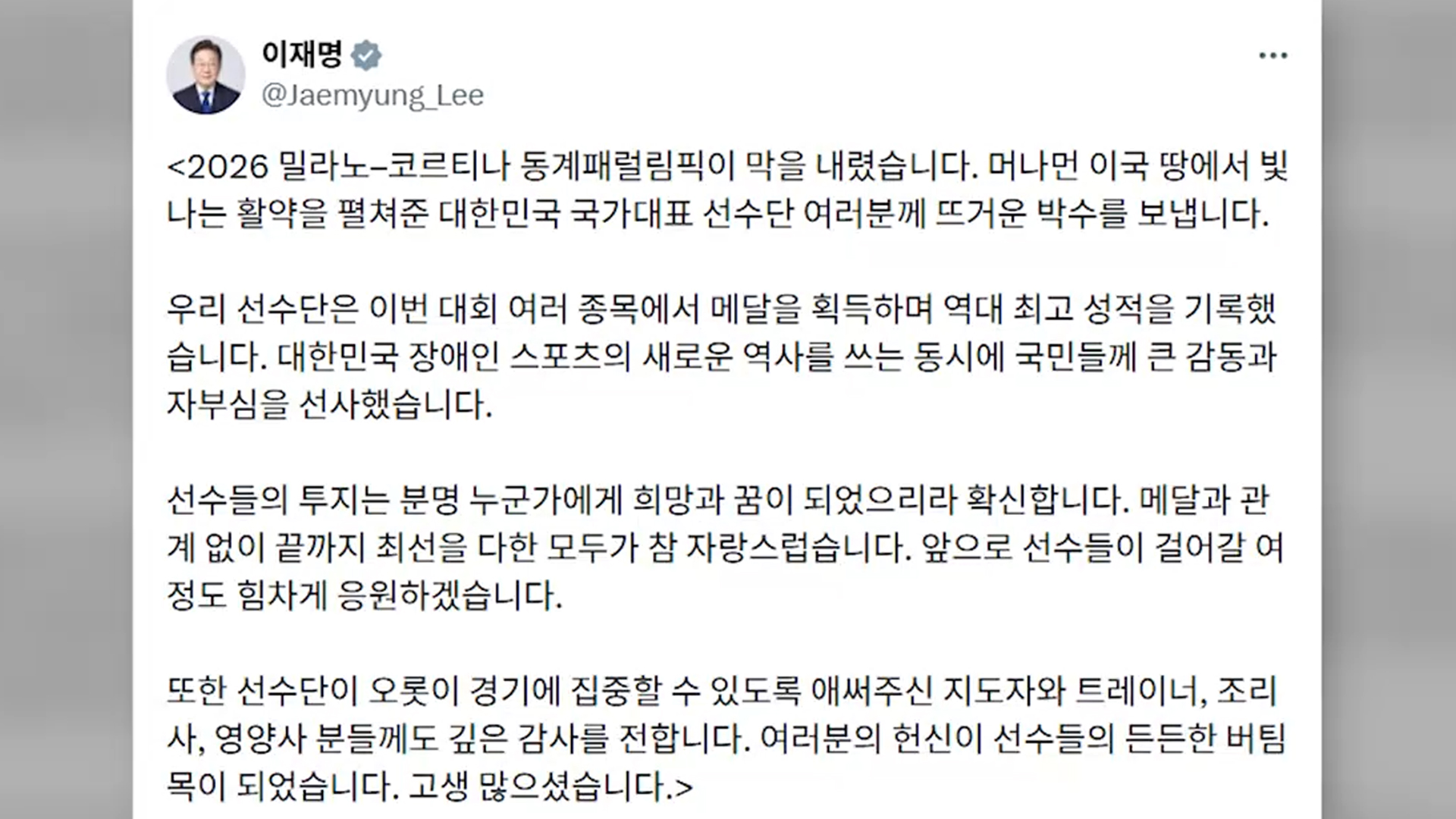 이재명 대통령이 막을 내린 밀라노–코르티나 동계패럴림픽에 참가한 국가대표 선수단을 향해 "뜨거운 박수를 보낸다"라고 격려했습니다.