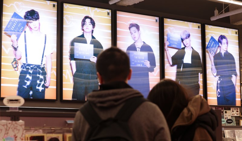 방탄소년단(BTS)의 컴백 공연을 닷새 앞둔 16일 서울 명동의 한 K팝 굿즈 판매점에서 외국인 팬이 BTS 관련 상품을 고르고 있다. 사진=뉴스1화상 |