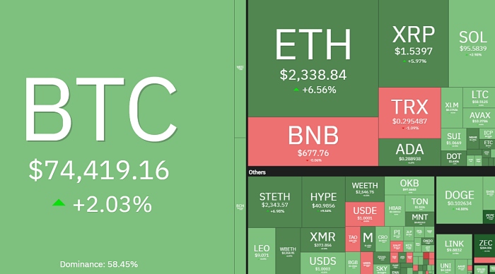 [디지털투데이 AI리포터] 비트코인이 7만4000달러선을 돌파하며 상승세를 이어가고 있다. 시장 전반에 매수세가 유입되면서 주요 알트코인도 동반 상승하는 흐름을 보였다.