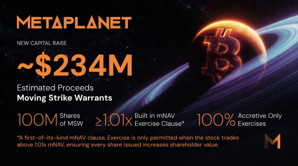 Metaplanet has issued 100 million Moving Strike Warrants with a first-of-its-kind mNAV clause. Exercise is only permitted when the stock trades above 1.01x mNAV, ensuring every share issued increases shareholder value. This enables the company to raise an estimated $234M in… pic.twitter.com/bdqxOs5gRs