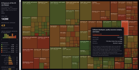 안드레이 카파시가 공개한 미국 노동시장의 AI 노출도. 깃허브 저장소 캡처. |