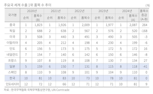 2020년 대비 2024년 일본의 1위 품목 수는 159개에서 118개로 41개 줄어든 반면, 한국은 81개를 유지했다.
