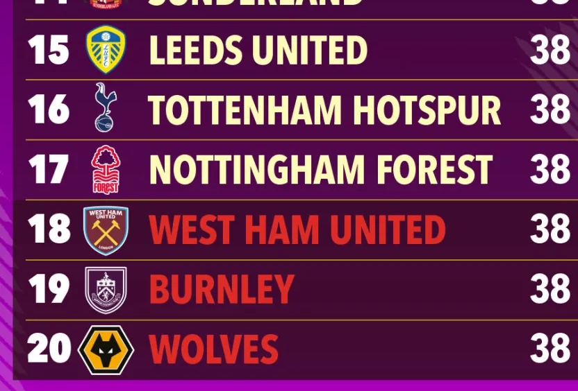 매체는 "토트넘, 노팅엄, 웨스트햄이 모두 승점 37로 시즌을 끝낼 거라고 예상됐다. 웨스트햄이 골득실(-24)에 의해 강등될 거라고 전망됐다"라고 설명했다.