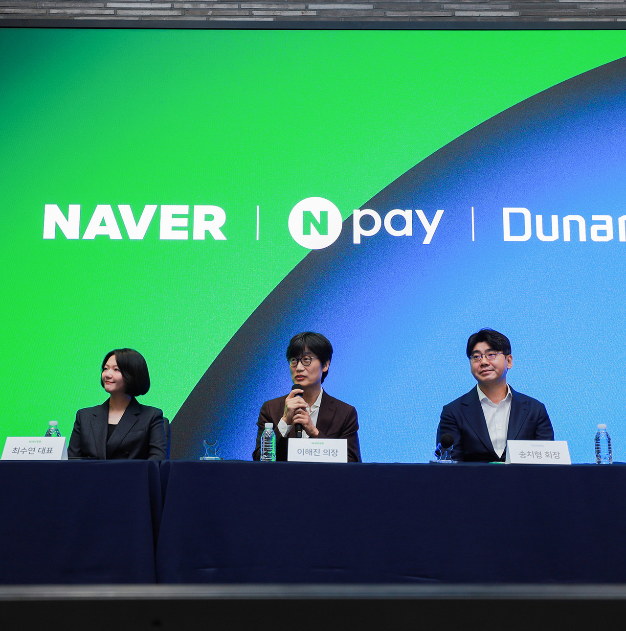 경기도 성남시 네이버 1784에서 지난해 11월 열린 네이버-두나무 합병 기자간담회에 참석한 최수연(왼쪽부터) 네이버 대표이사, 이해진 네이버 이사회 의장, 송치형 두나무 회장 [네이버 제공] |