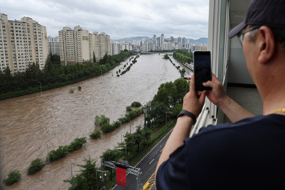 집중호우가 내린 지난해 8월 13일 한 시민이 범람한 중랑천과 통제된 동부간선도로를 사진으로 찍고 있다. [사진=연합뉴스] |