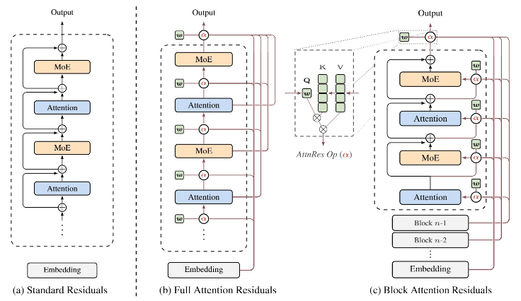 문샷 AI 연구진은 15일(현지시간) 기존 트랜스포머 구조의 핵심 요소였던 잔차 연결(Residual connection)을 대체하는 새로운 방식인 '주의 잔차(AttnRes·Attention Residuals)'를 공개했다.