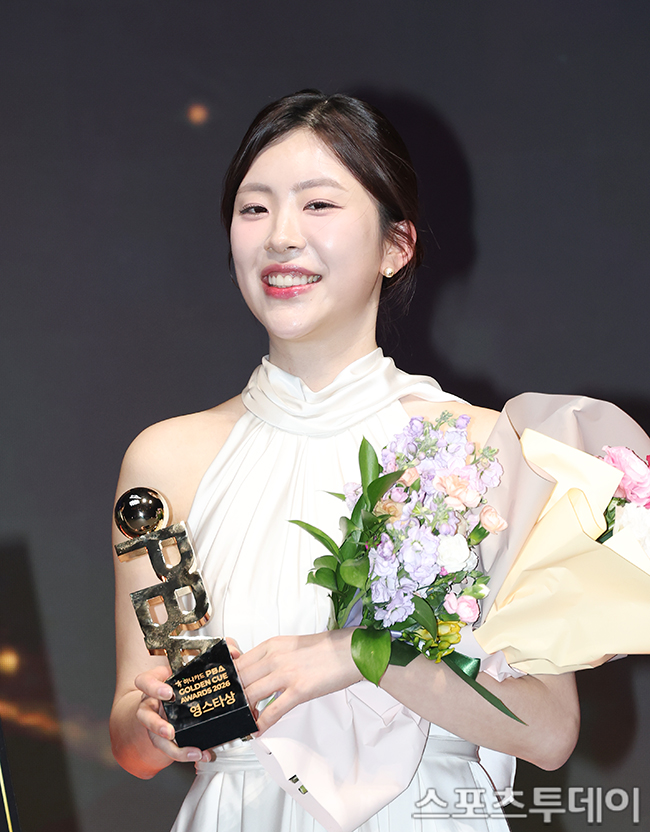 [스포츠투데이 권광일 기자] '2026시즌 프로당구 PBA 골든큐 어워즈'가 17일 서울 광진구 광장동 그랜드워커힐 서울에서 열렸다. 정수빈이 영스타상을 수상하고 있다. 2026.03.17.