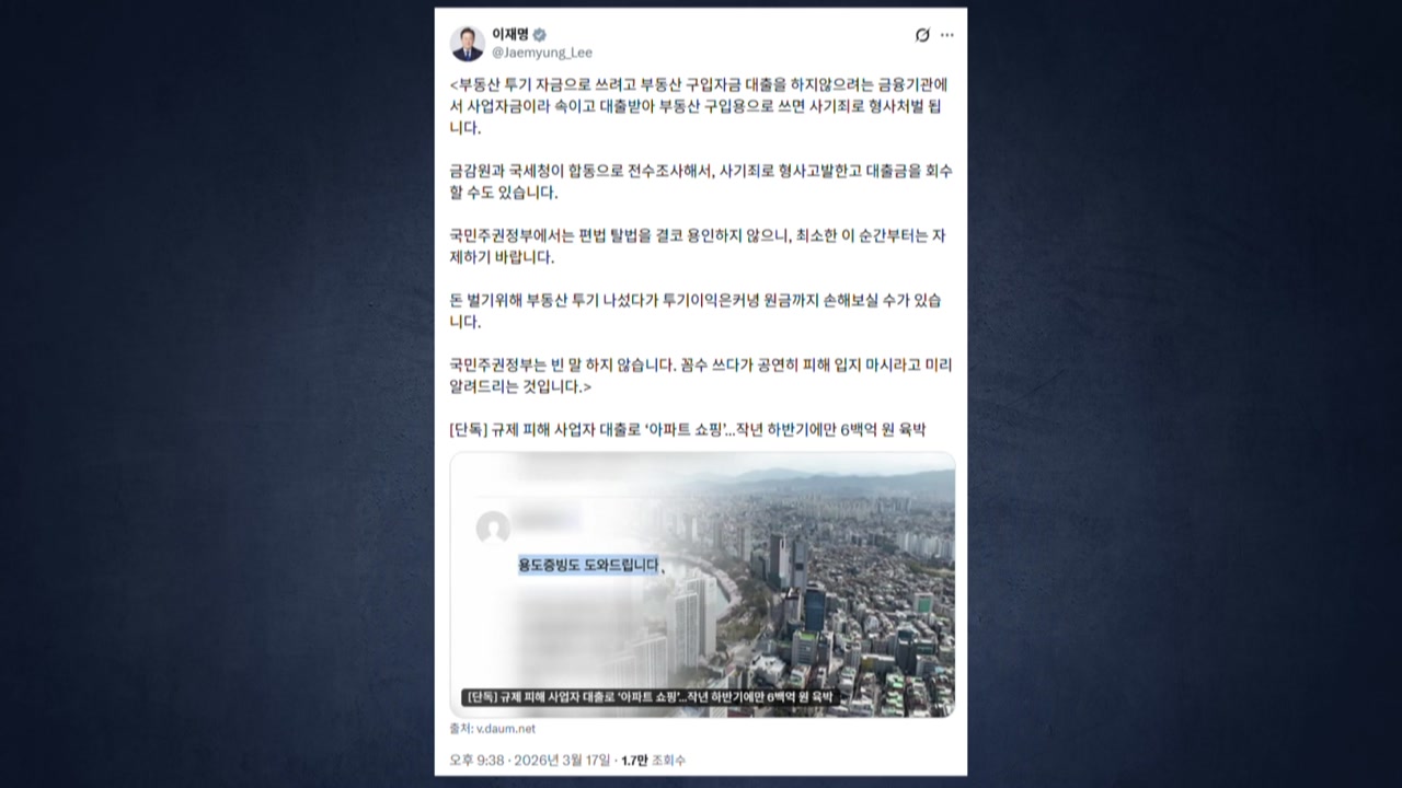 이 대통령은 오늘(17일) SNS에, 지난해 하반기 개인사업자대출을 받아 주택 구입 등에 쓰는 '용도 외 유용' 사례가 급증했다는 기사를 공유하며, 이같이 적었습니다.