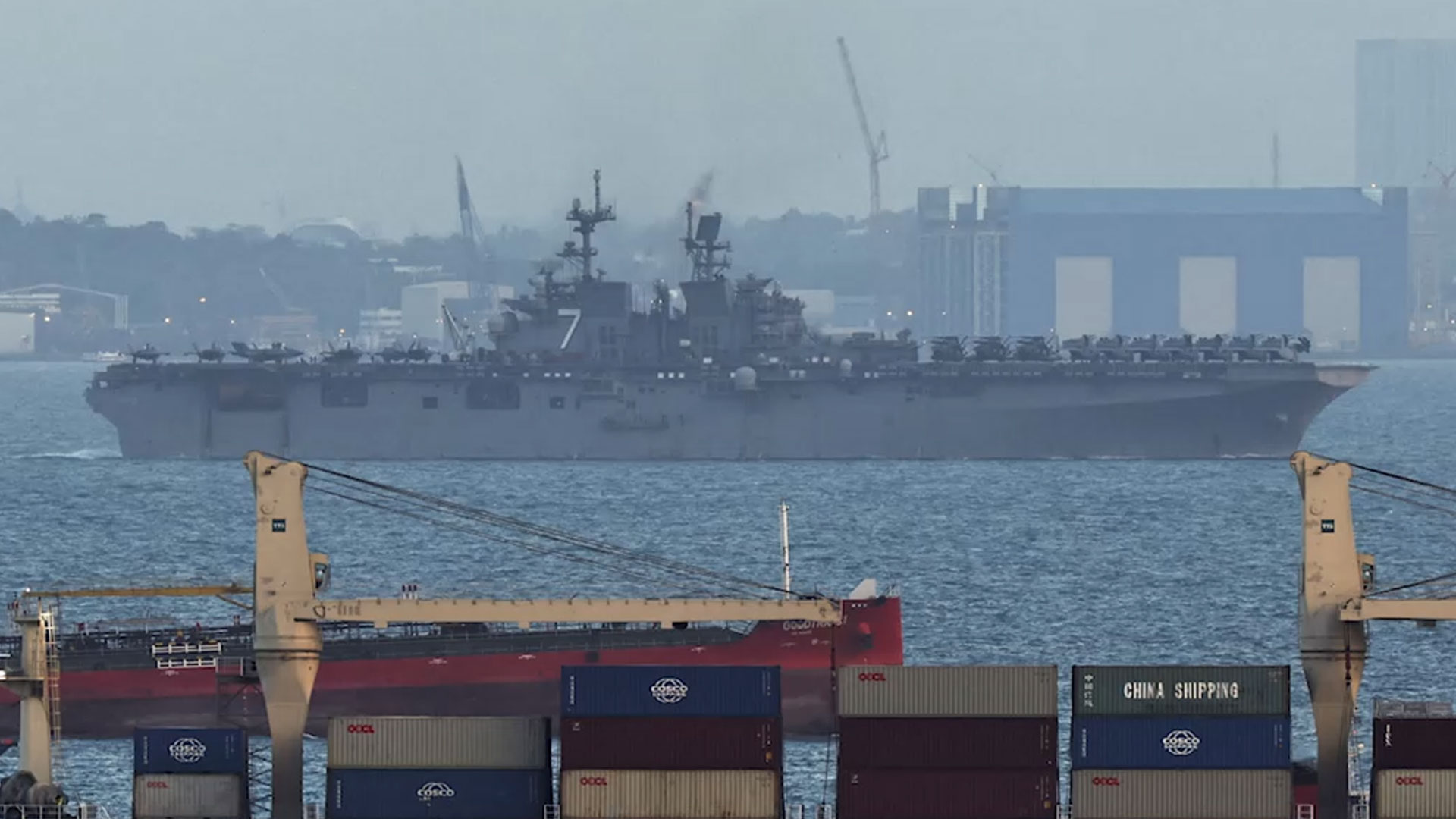 중동으로 향하는 미국 해병대원 수천 명을 태운 것으로 보이는 미 해군 군함이 싱가포르 근처 해역을 지나고 있다는 보도가 나왔습니다.