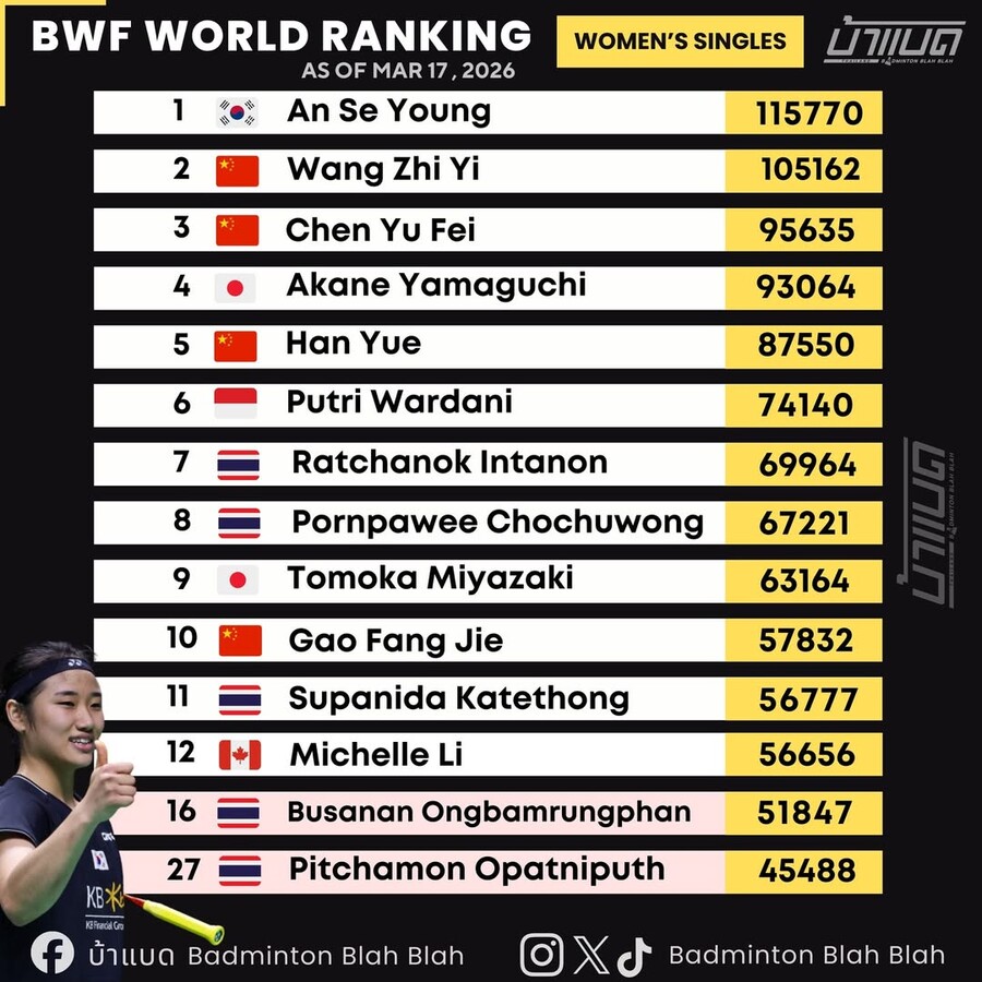 전 세계 배드민턴 소식을 전하는 '배드민턴 블라블라'가 17일(한국시간) "3월 17일자, 여자 싱글 월드 랭킹"이라는 문구와 함께 여자 싱글 1위부터 순서대로 선수들의 이름과 국적, 그리고 랭킹 포인트를 공개했다.