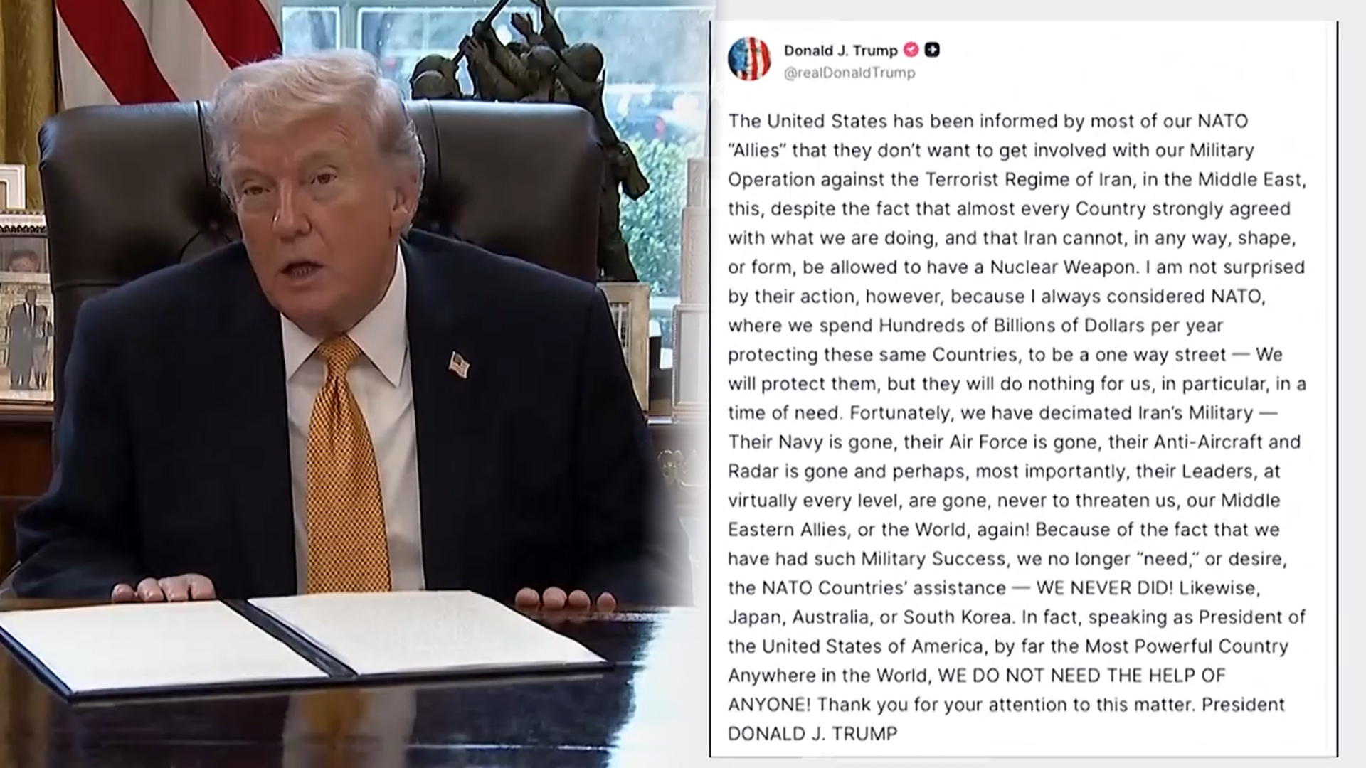 트럼프 대통령은 "우리는 상당한 군사적 성공을 이뤘기 때문에 더 이상 나토 회원국들의 지원이 필요하지도 않고 바라지도 않는다"라고 말했습니다.