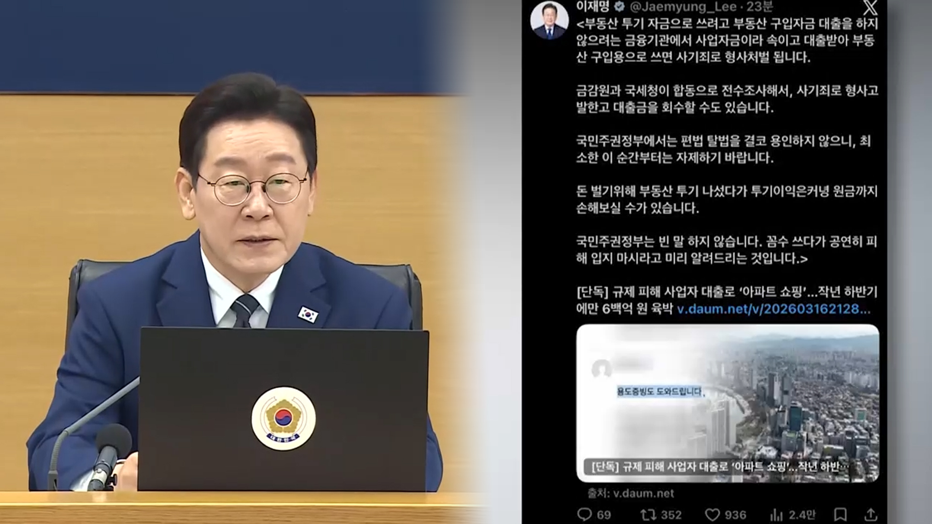 이 대통령은 어제(17일) 자신의 SNS에 개인 사업자 대출로 주택을 매입하는 '용도 외 유용' 적발 사례가 급증하고 있다는 언론 보도를 링크하고 이같이 적었습니다.