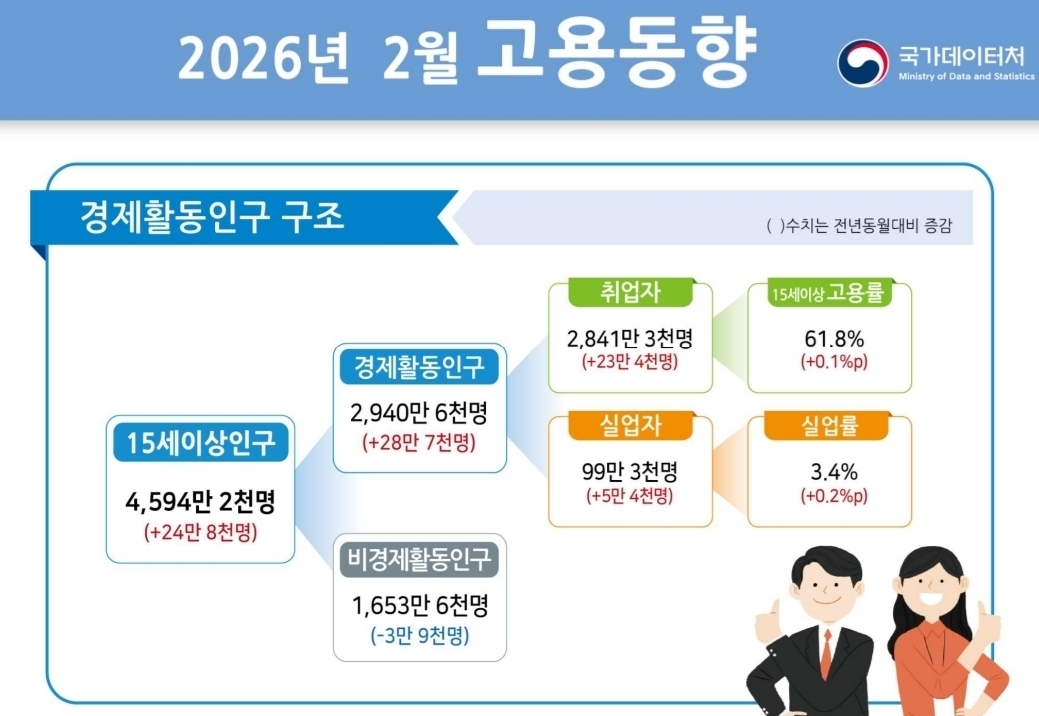 18일 국가데이터처가 발표한 '2026년 2월 고용동향'에 따르면, 지난달 15세 이상 취업자는 2841만3000명으로 1년 전보다 23만4000명 증가했다.
